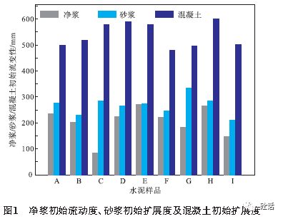 水泥净浆初始流动度、砂浆初始扩展度、混凝土初始扩展度值见图1。