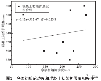 以水泥净浆初始流动度对混凝土初始扩展度做散点图,线性回归见图2。