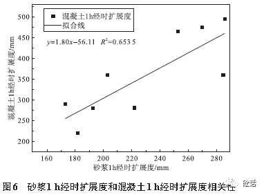 以砂浆1h经时扩展度对混凝土1h经时扩展度做散点图,线性回归见图6。